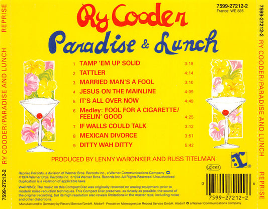 Ry Cooder - Paradise And Lunch (CD, Album) (VG+ / VG+)