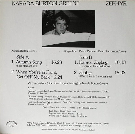 Narada Burton Greene* - Zephyr (Compositions For Solo Harpsichord And Piano) (LP, Album) (VG+ / VG)