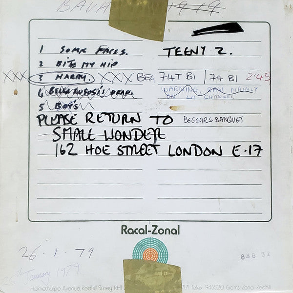 Includes 20" x 20" poster and colour printed inner sleeve. The Bela Session is the complete recording session including previously unreleased tracks.. Recorded 26 January, 1979, at Beck Studios, Gisburne Road, Wellingborough. This has been produced directly by the band with Leaving Records, in advance of the band’s Ruby (40th) anniversary. “Bela Lugosi’s Dead” was originally released by [l29961, 1979. “Harry” was originally released by [l2056, 1982. “Some Faces,” “Bite My Hip,” and “Boys (Original)” are previously unreleased. Some copies come with wrong "white vinyl" sticker (see last picture).
