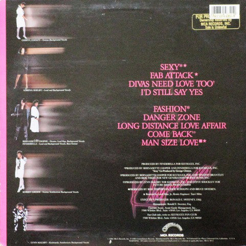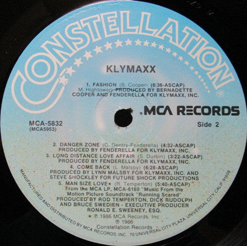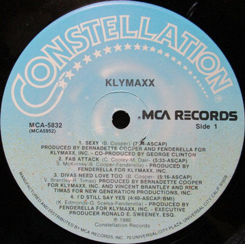 LP housed in a dust sleeve with lyrics. Label Variation Produced for Klymaxx, Inc. A3 Co-produced for New Generation Productions, Inc. B4 Co-produced for Future Shock Productions ℗ 1986 Constellation Records © 1986 MCA Records, Inc.