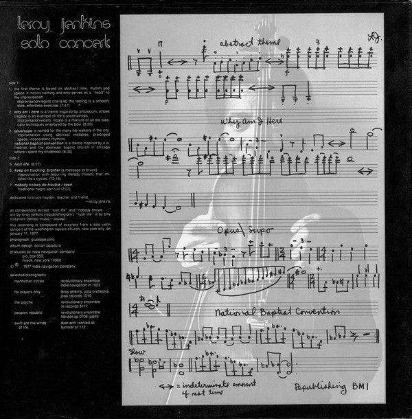Dedicated to Bruce Hayden, teacher and friend. - Leroy Jenkins This recording is composed of excerpts from a solo violin concert at the Washington Square Church, NYC, on January 11,1977.