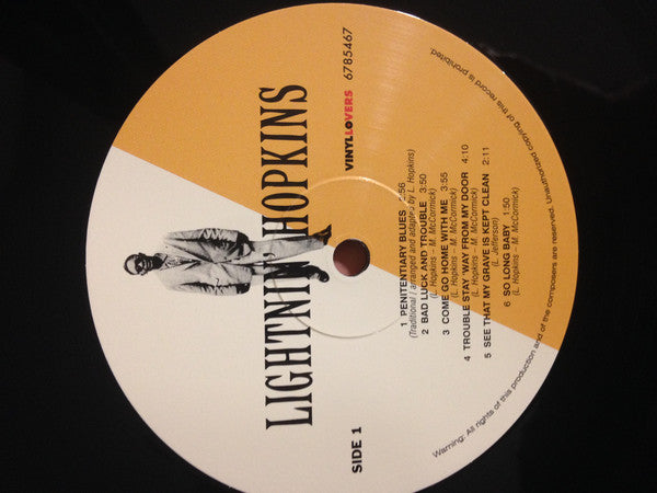 ℗ & © 2017 VINYL LOVERS 6785467 Photos: X. Made in the E.U. Recorded at 2803 Hadley St., Houston, TX, USA January 16, 1959 by Samuel B. Charters using Ampex Equipment, with an EV 636 microphone. Tracks A6, B6 are bonus tracks. *Bonus tracks: Lighting Hopkins solo recordings. Produced by Mack McCormick. Recorded in Houston, Texas. February 1959. Editor's Note: Since there were no liner notes on the first LP edition of the album, Lightnin' Hopkins (Folkways, FS-3822, 1959), we have transcribed the above notes published in the 1990 reissue, Lightnin' Hopkins (Folkways, -40019, 1990). Direct Metal Mastering (DMM)