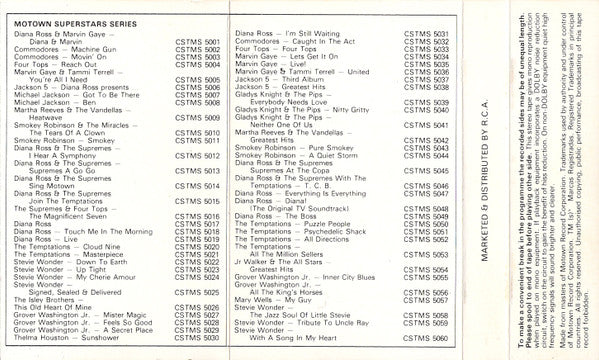 Grey Cassette with blue on-body print On the J Inlay: ℗ 1964 Motown Record Corporation Marketed & Distributed by R.C.A. Motown Superstar series - A list of cassette re-issues in the series On the Cassette: [Dolby System RCA Limited, Record Division, England