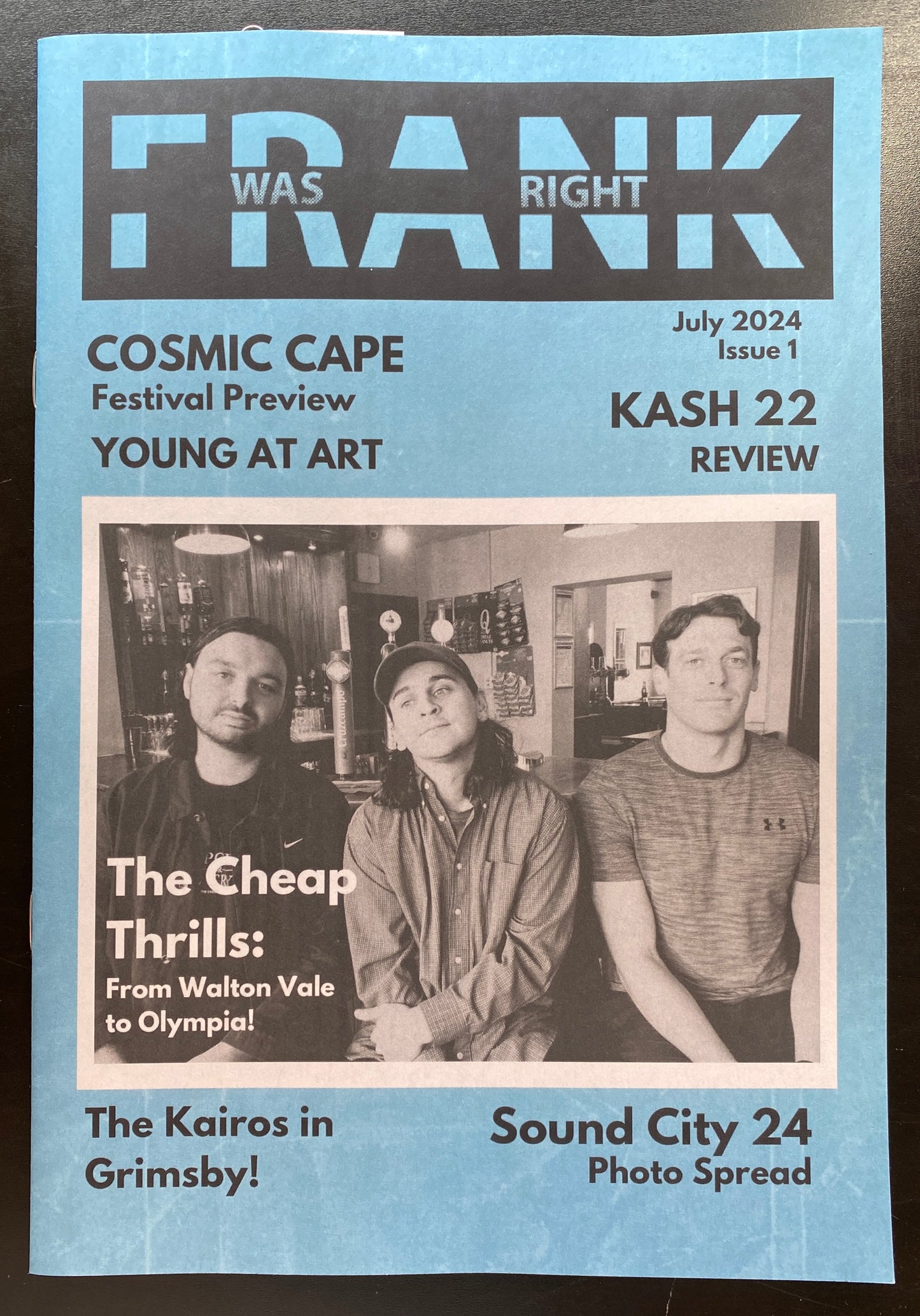 "Alright. How you doing? Welcome to Issue One of 'Frank Was Right'. But you can call us 'Frank'. Our mission is simple. We want to shine a light into the crevices of the creatives in Merseyside's music scene. Our first edition takes us from Walton Vale to Widnes, and from Capenhurst to Cleethorpes! Our cover story is an interview with The Cheap Thrills looking forward to their Olympia gig later in the year. We head out east to see how The Kairos got on in sunny Lincolnshire. There's an interview with local conceptual artist Alan Dunn about his 10 year long Paul Young 'No Parlez' project. We preview this year's 'Cosmic Cape' festival with director Luke Done, and head out to Frodsham to check out live music venue Kash 22." - Frank