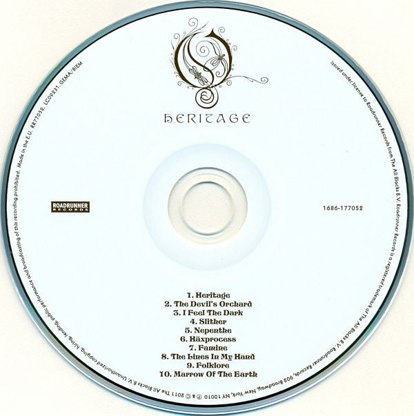 ℗ & © 2011 The All Blacks B.V. Standard jewel case version with a 12 page booklet. If purchased through Opeth's online store an exclusive 32 page "Making of Heritage" booklet is included. "Slither" recorded as a tribute in memory of [a291557. Made in the E.U. Recorded during various stages throughout late 2010 and early 2011. Main sessions were recorded at Atlantis Studios, Stockholm, between January 31 and February 21. Additional vocals and FX recorded during a few days in March at No Man's Land Studios, Hemel Hempstead, UK. Demo-keepers and additional Mellotron recorded at Junkmail Studios, Stockholm, on various dates.