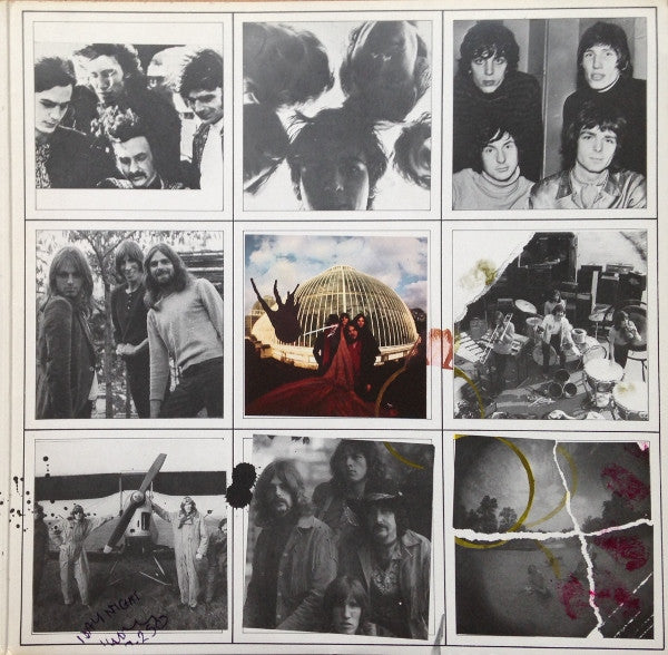 1st UK issue. Green "Harvest" labels. Matt gatefold sleeve with 2 inners die cut on 3 of the 4 corners. A bundling of The Piper At The Gates Of Dawn and A Saucerful Of Secrets with a new cover. Piper At The Gates Of Dawn was released in 1967 and A Saucerful Of Secrets was released in 1968. This version features a picture of "W. R Phang's Dental Surgery" (a genuine business) on the top right on the front cover. This version was withdrawn following objections from Dr. Phang due to dentists not being allowed to advertise. A later version came out featuring a picture of a gargling monk. Labels: The Gramophone Co. Ltd (Upper rim text) ℗ 1967 EMI Records Ltd. (A & B-side) ℗ 1968 EMI Records Ltd. (C & D-side) Made in GT Britain Sleeve: Made and printed in Great Britain. The Piper At The Gates Of Dawn: Produced 1967 A Saucerful Of Secrets: Produced 1968 Release date sourced from pinkfloydarchives.com