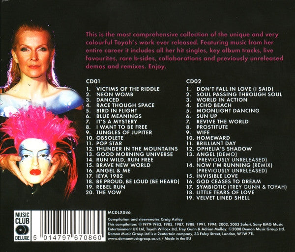Comes in a cardboard slipcase. ℗ 1979-1983, 1985, 1987, 1988, 1991, 1994, 2002, 2003 Safari, Sony BMG Music Entertainment UK Ltd, Toyah Willcox Ltd, Trey Gunn & Adrian Molloy © 2008 Demon Music Group Ltd. Made in the EU. Demon Music Group Ltd is a 2 Entertain Company. Track times taken from bit-perfect WAV files. Track 1-6 "Blue Meanings" writing credits erroneously given in the booklet as Bogen / Willcox / Bogen Track 2-14 "Now I'm Running (Remix)" has anomalous production credits. They are given as both "Originally produced by Phil Nicholas & Toyah (1992), and "Original version of 14 and 15-16.... Produced by Toyah Willcox, Paul Nicholson, Chris Binns & Dave Kingsley"